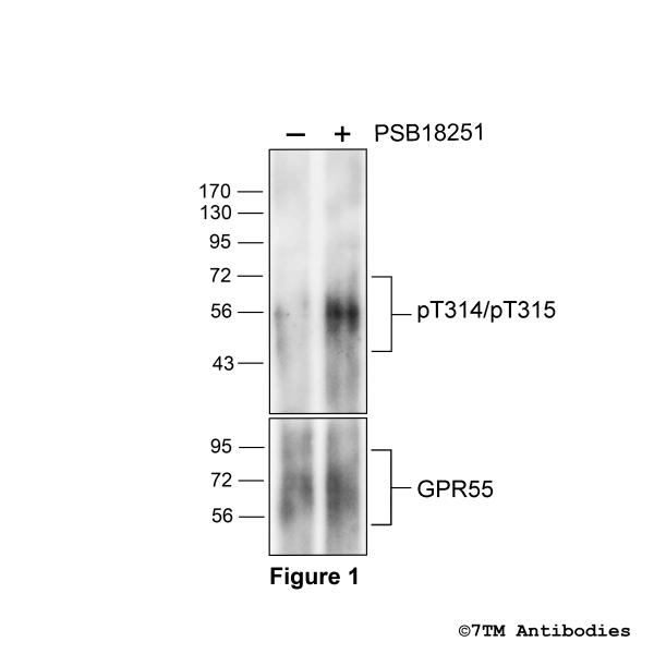 Threonine314/Threonine315 (T314/T315) is major phosphorylation site of human GPR55 receptor. The pT314/pT315-GPR55 antibody detects phosphorylation in response to agonists. T314/T315) phosphorylation is likely to be involved in efficient ligand sequestration by GPR55.