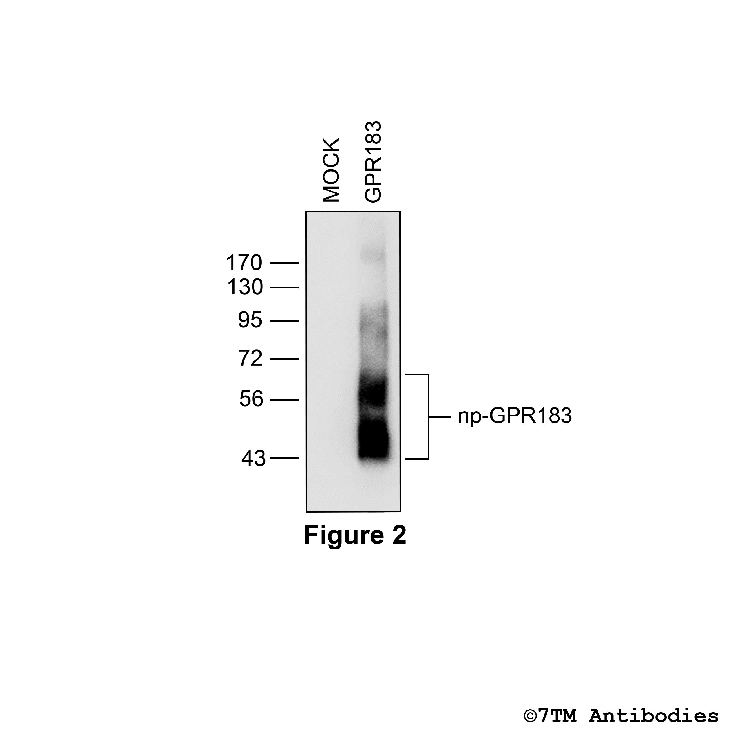 Figure 2. Validation of the GPR183 Receptor in transfected HEK293 cells. Native HEK293 cells (MOCK) or HEK293 cells stably expressing the GPR183 Receptor (GPR183) were not exposed or exposed to 100 nM of specific GPR183-Receptor agonist 7α,25-OHC for 5 minutes, lysed and immunoblotted with the phosphorylation-independent anti-GPR183 antibody (7TM0081N-GP) at a dilution of 1:1000.