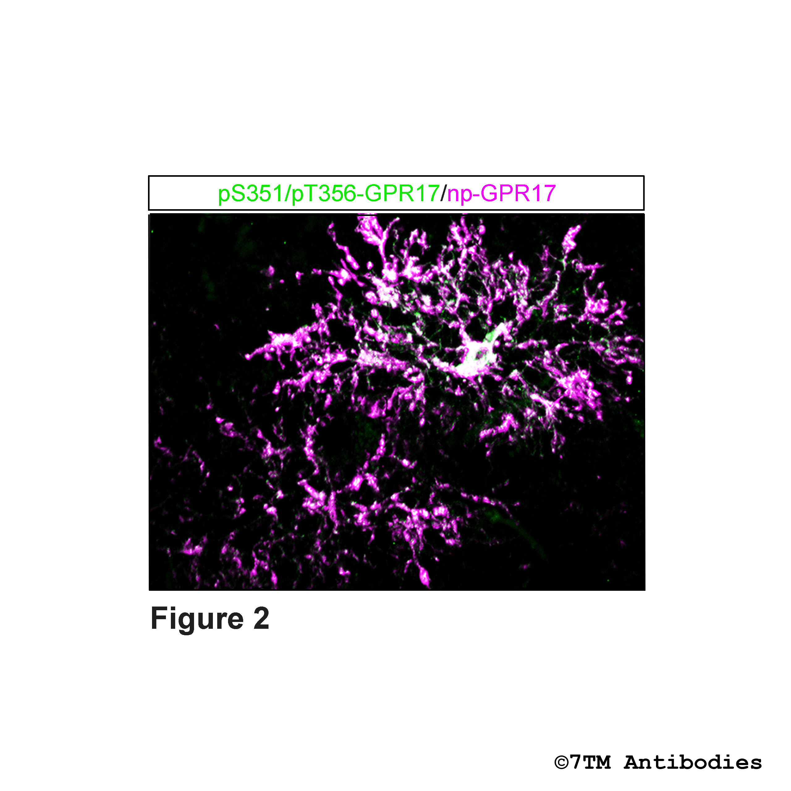 Serine351/Threonine356 (S351/T356) is a major phosphorylation site of the human GPR17 receptor. The pS351/pT356-GPR17 antibody detects phosphorylation in response to high-efficacy agonists. S351/T356 phosphorylation is a key regulator of human GPR17 desensitization, β-arrestin recruitment and internalization.