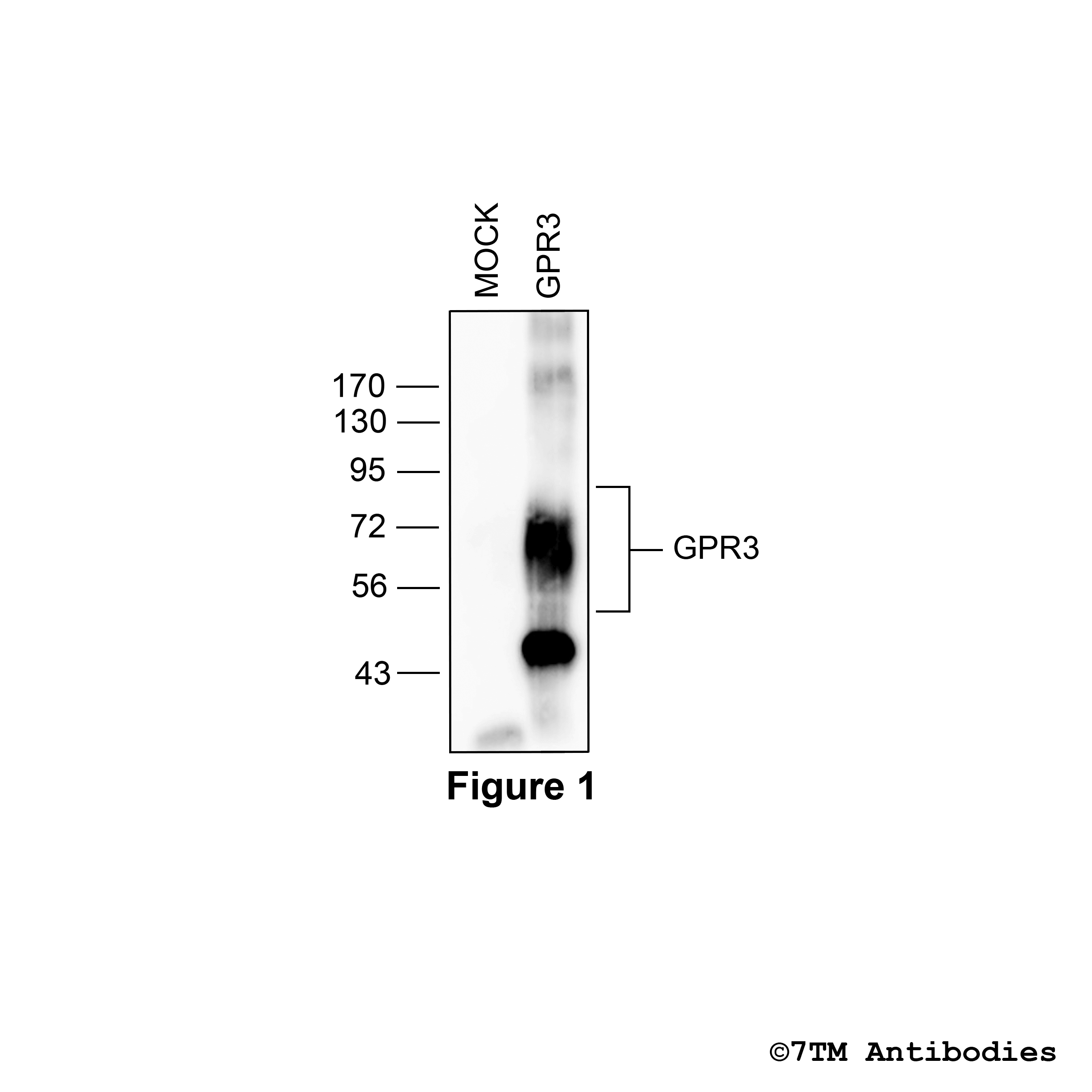 Figure 1. Validation of the GPR3 Receptor in transfected HEK293 cells. Native HEK293 cells (MOCK) or HEK293 cells stably expressing the GPR3 Receptor (GPR3) were lysed and immunoblotted with the phosphorylation-independent anti-GPR3 antibody (7TM0083N) at a dilution of 1:1000.