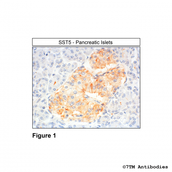 Figure 1. Immunohistochemical identification of Somatostatin Receptor 5 in human pancreatic islets. Sections were dewaxed, microwaved in citric acid, and incubated with anti-SST5 (Somatostatin Receptor 5) antibody (7TM0359N-IC) at a dilution of 1:100. Sections were then sequentially treated with biotinylated anti-rabbit IgG and avidin-biotin solution.Color was developed by incubation in AEC, and sections were counterstained with hematoxylin. Note, SST5 receptors were detected at the plasma membrane of nearly all cells in human pancreatic islets.