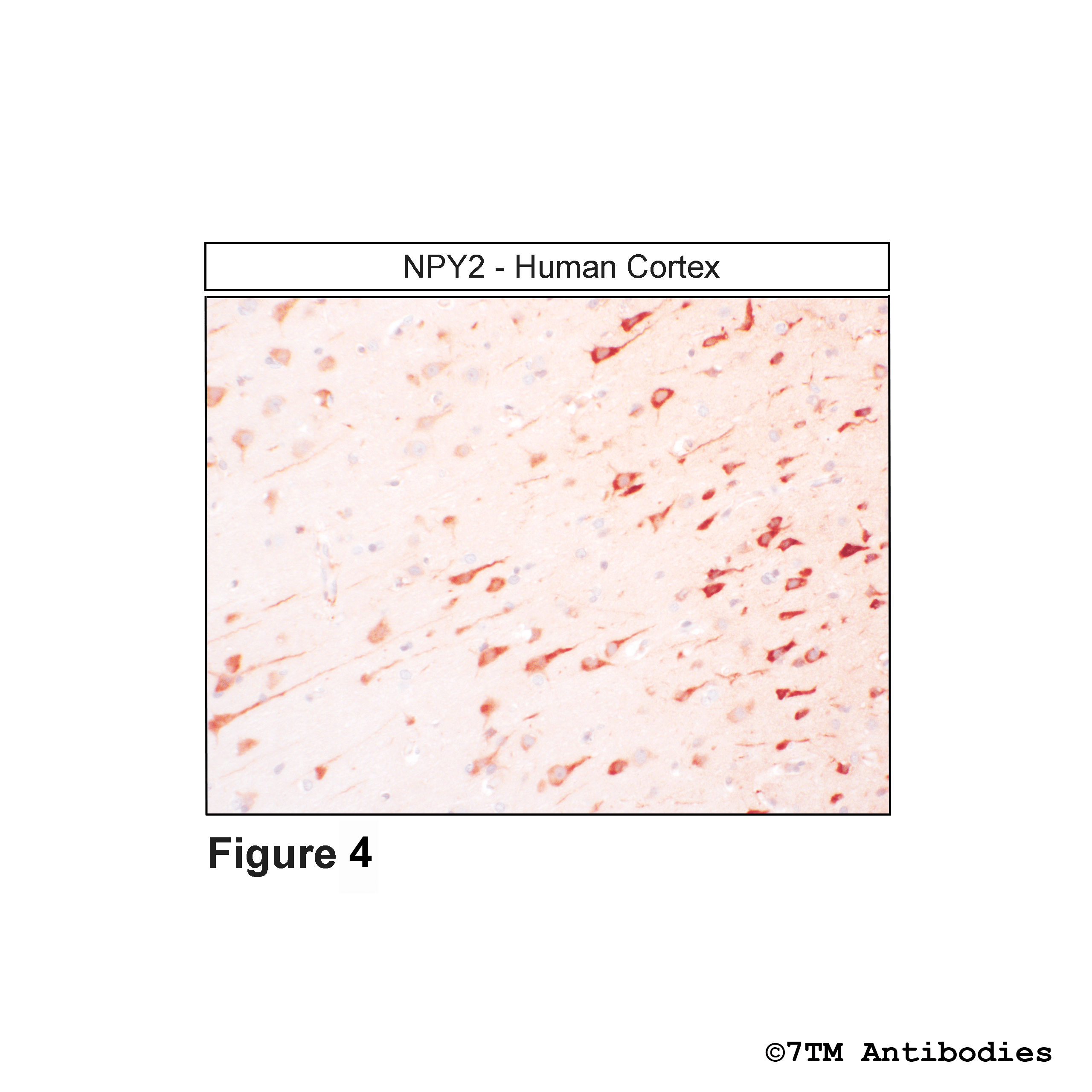 Figure 4. Immunohistochemical identification of  Neuropeptide Y Receptor 2 in human cortex. Sections were dewaxed, microwaved in citric acid, and incubated with anti-NPY2 (non-phospho-Neuropeptide Y Receptor 2) antibody (7TM0306N) at a dilution of 1:100. Sections were then sequentially treated with biotinylated anti-rabbit IgG and avidin-biotin solution. Color was developed by incubation in 3-amino-9-ethylcarbazole (AEC), and sections were counterstained with hematoxylin.