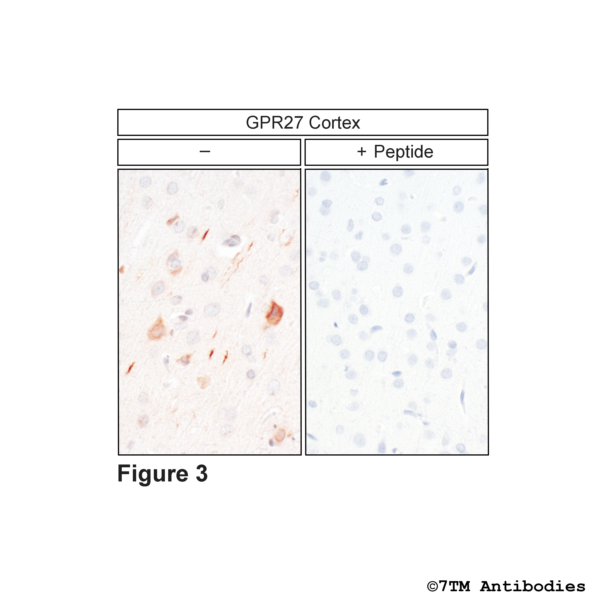 Figure 3. Immunohistochemical varification of  GPR27 Receptor antibody in cortex. Sections were dewaxed, microwaved in citric acid, and not exposed (left pannel) or exposed to peptide (right pannel) that was used for production of anti-GPR27 (non-phospho-GPR27 Receptor)) antibody (7TM0097N). Sections were then incubated with anti-GPR27 (non-phospho-GPR27 Receptor) antibody (7TM0097N) at a dilution of 1:100 and sequentially treated with biotinylated anti-rabbit IgG and avidin-biotin solution. Sections were then developed in 3,3-diaminobenzidine (DAB)-glucose oxidase and lightly counterstained with hematoxylin. Note, only in sections without peptide incubation GPR27 receptors were uniformly detected at the plasma membrane of cells.